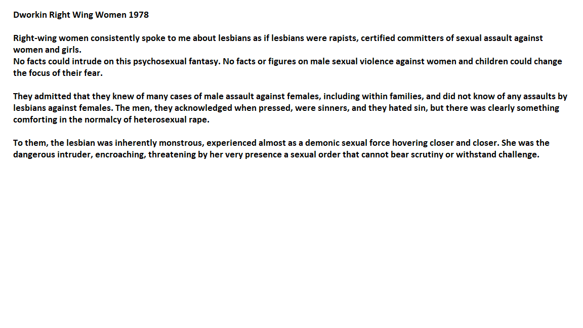 Lisa T Mullin @LisaTMullin @ShaggyDemiurge @TheEmmelineMay They are modern day version of the white right wing women that Dworkin wrote about, though then it was lesbians they obsessed about. Women who've made the Patriararchal Bargain.